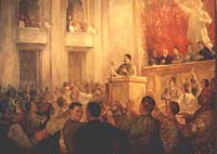 Хор клянется в верности Ленинским идеям и в любви к товарищу Сталину. Из к/ф "Будем как Ленин"